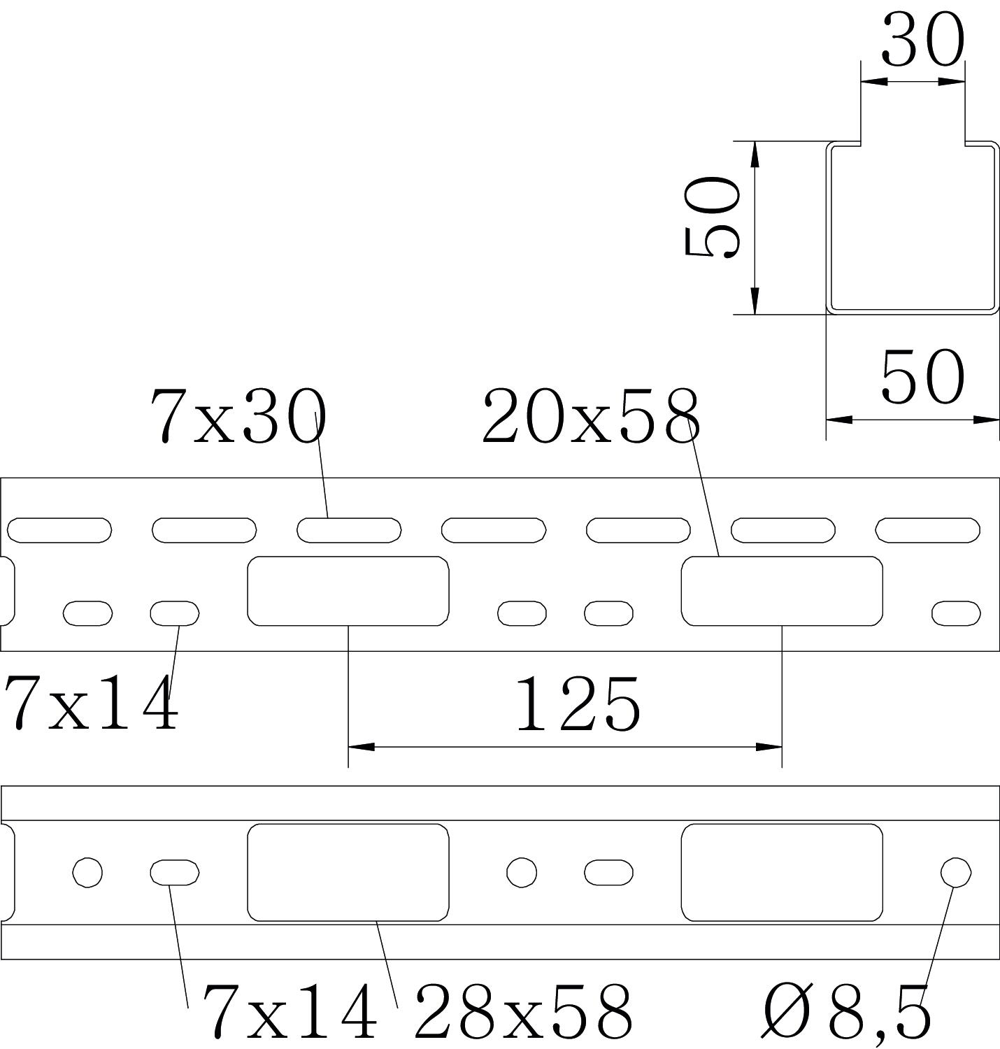 Lengte a 3m. AZ-kanaal geperf 50x50 rvs A4 1.4571 blank OBO